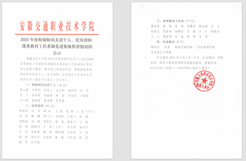 2025年度师德师风先进个人、优秀教师、优秀教育工作者和先进集体推荐情况的公示