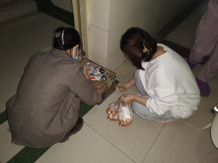 被封控后正是武汉大幅降温的时候,但是志愿者们还是不辞辛苦地下楼领餐,在冷风中抬着饭盒上楼给同学们分发餐食。在其他同学们吃饭时,她们的工作也并没有结束,还需要统计生科学院每个女生宿舍的发餐情况并上报。“刚开始时确实有点手忙脚乱,但是多做几次就好很多了,这也是疫情对我们的小考验吧,”志愿者张晓慧说道。