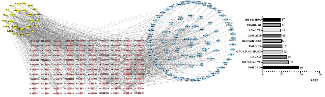 Fig 1."Anxiety and depression targets-active ingredients-medicine and food homologous medicinal materials" network and Edge’s top ten medicinal and food homologous varieties
