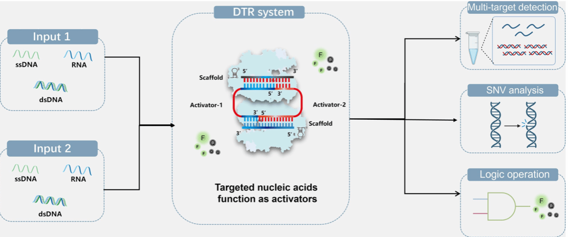 该研究提出了一种全新的CRISPR/Cas12a检测系统——DTR系统(Double-Target Responsive system),该系统首次实现了对非连续RNA和DNA目标的同时、高灵敏度、高特异性检测,为分子诊断与临床检测提供了创新工具。