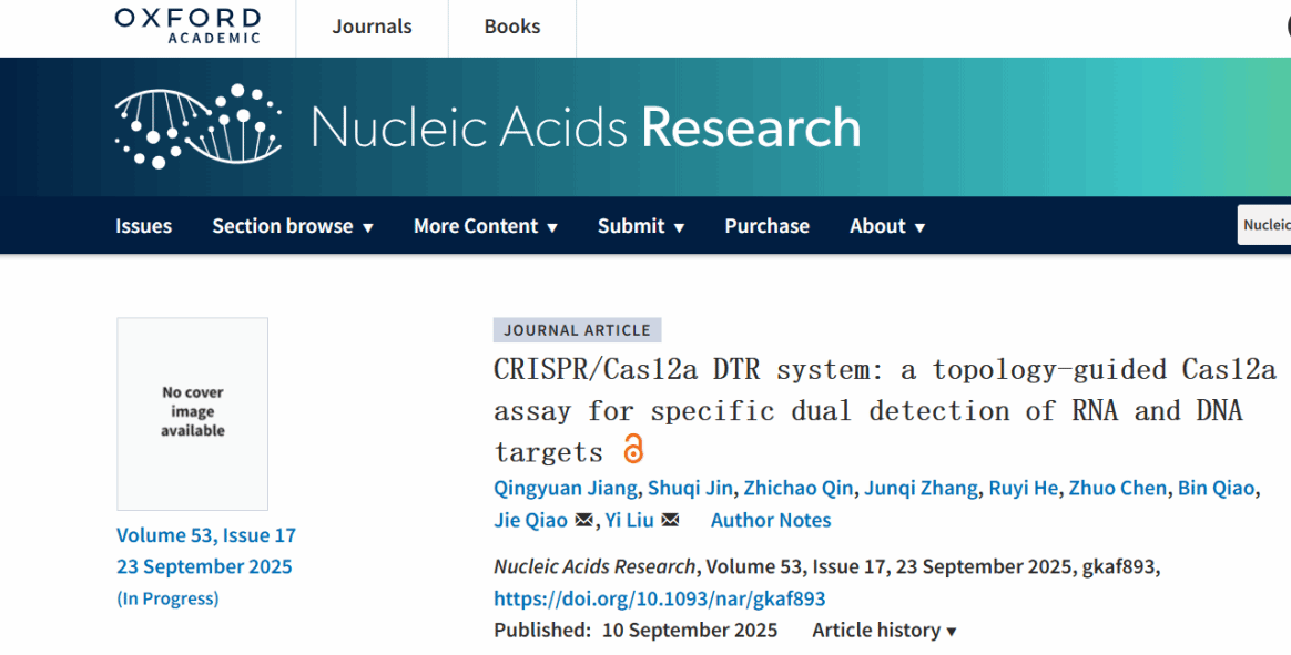 近日,新葡的京乔洁副教授课题组在国际顶尖期刊《Nucleic Acids Research》杂志(影响因子13.3)发表最新研究成果“CRISPR/Cas12a DTR System: A Topology-guided Cas12a Assay for Specific Dual Detection of RNA and DNA Targets.”(图1)。其中,新葡的京2022级生物技术专业本科生秦志超为本文共同第一作者。