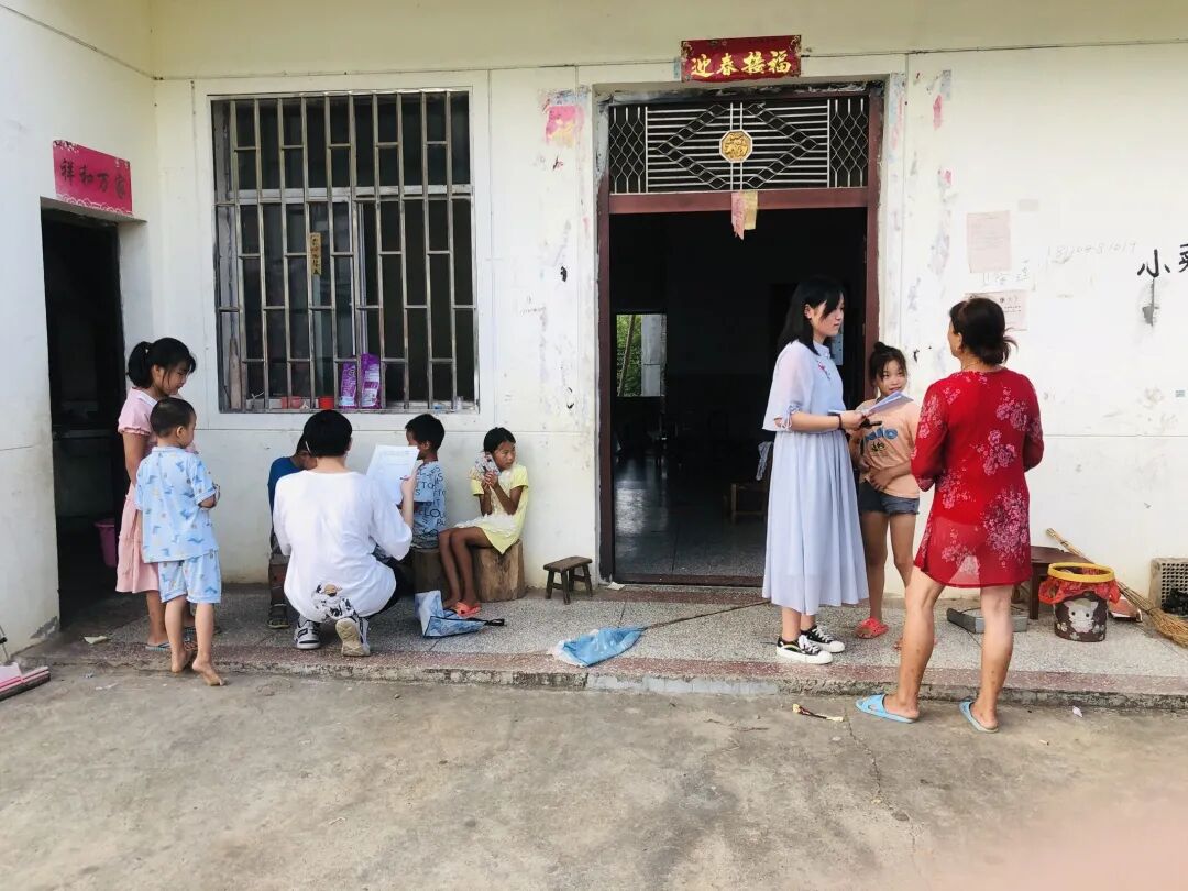 图为团队成员正在进行家庭走访,询问村里大人小孩关于村里的具体情况