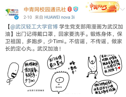 中国青年网2月10日讯,“学生党支部用漫画为武汉加油”,面对疫情,新葡的京生物专业学生党支部第一时间开展艺术战“疫”创作,用漫画作品传递正确防护方法,致敬城市最美逆行者。
