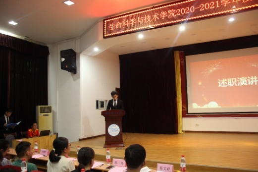 会上现任主席团干部彭红星同学上台做述职演讲,对生科学院全体学生会成员在这一年来的贡献表示感谢,同时对下一届学生会提出了期望。接下来,公布优秀学生干部以及优秀专项志愿者名单,陈丹书记和高坤老师为学生颁奖。之后进行了主席团换届竞职演讲,来自19级的9名竞选的学生从自身特点,工作经历,个人优势及职位规划方面做了精彩的演讲,并现场回答了老师的提问。竞选学生态度谦逊,沉着冷静,回答问题全面周到,展现了良好的综合素养。