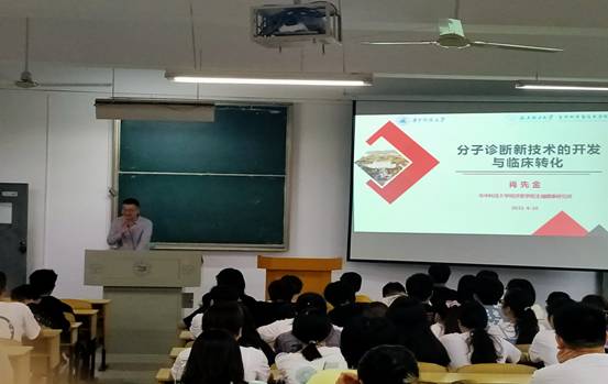 肖先金教授以分子诊断新技术的开发与临床转化为题简单介绍了生物制药专业及生物未来前景,介绍了基因突变与分子诊断的前沿技术发展情况,向同学们展示了分子诊断在临床上的运用以及团队研发的产品在医疗上的应用。李龙杰老师分享了自己求学、科研和联合培养经历,详细介绍了肖先金教授课题组产学研项目、夏令营实施方案和联合培养计划,鼓励同学们做好规划、有科研兴趣的同学提早进入实验室。