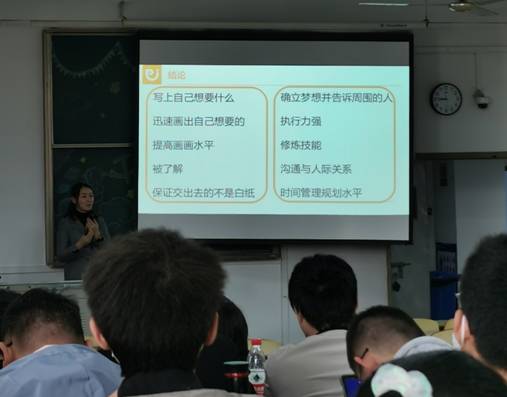 在报告中,大白老师首先对生涯规划状进行了介绍,随后大白老师以画出五年后的自己为题,组织同学们参与交流,并对如何实现自己的未来,做了具体的方法指导。讲座现场不时爆发欢声笑语,通过这个环节同学们对自己的未来有了初步的设想,也积极表达了自己的构思。大白老师对于如何认识自我从自测、他测和专业测等三个方面进行了介绍和指导,同时对自测提出了具体的方法,让同学们在课堂上对自己的优势进行现场自评,以便于同学们能够发现自己、认识自己,在今后的学习、工作和生活中能够更好的发挥自己的优势,改进自己的不足,并尽可能合理规划自己的学业和工作。