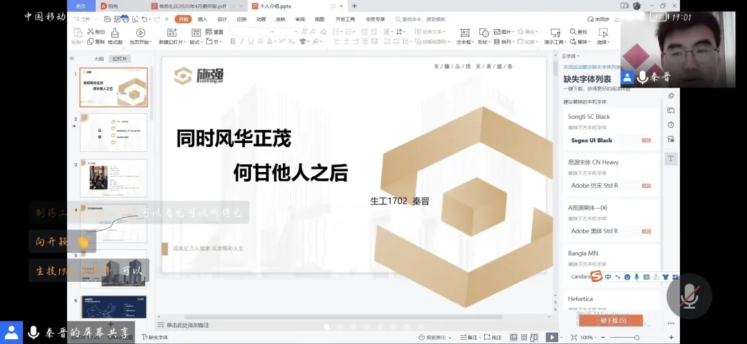 本次会议由生科院学生会校友联络与服务部成员刘可欣主持,秦晋主讲。秦晋,生物工程1702班毕业生,在校期间曾任生科学院学生会主席兼青年志愿者协会会长,于2021年3月份加入施强集团,现在公司中任管培生一职。