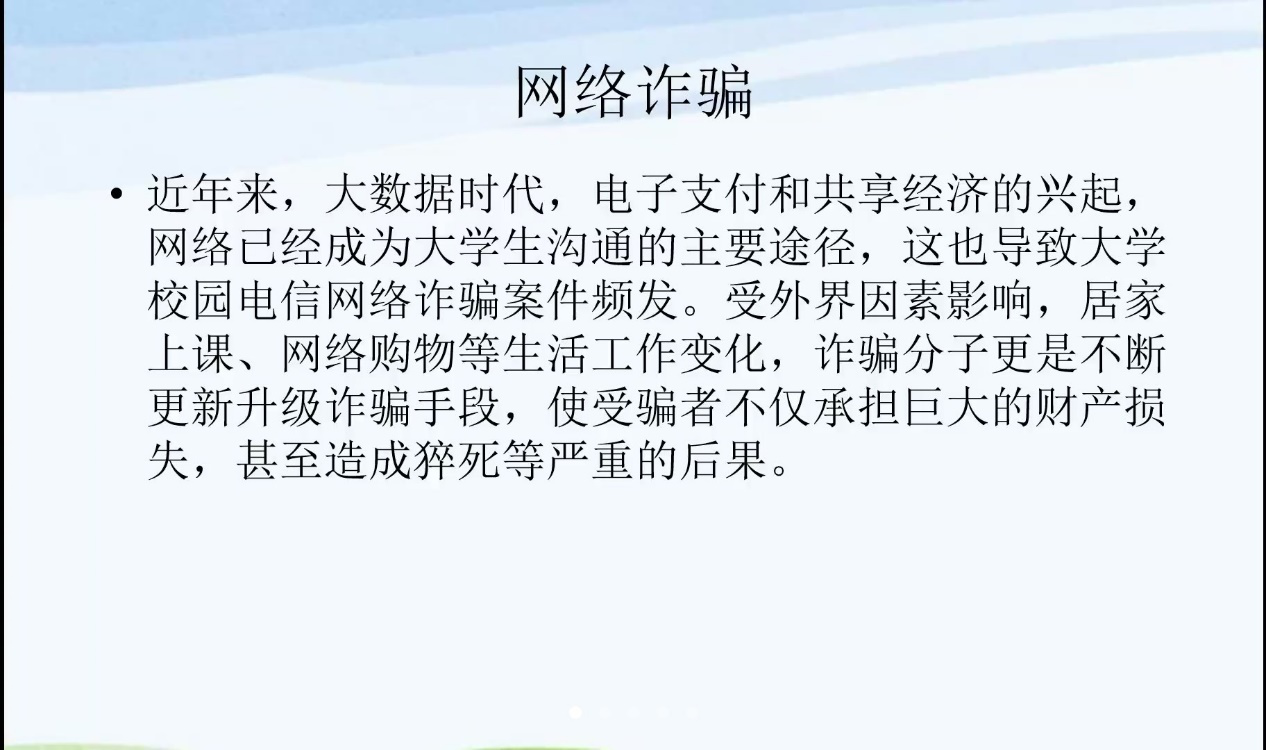 此次班会,旨在宣传防诈骗知识,提高同学们防骗警惕性,增强同学们诈骗应对能力。整个会议过程顺利,同学们交流融洽,会议效果良好,最终得以圆满结束。