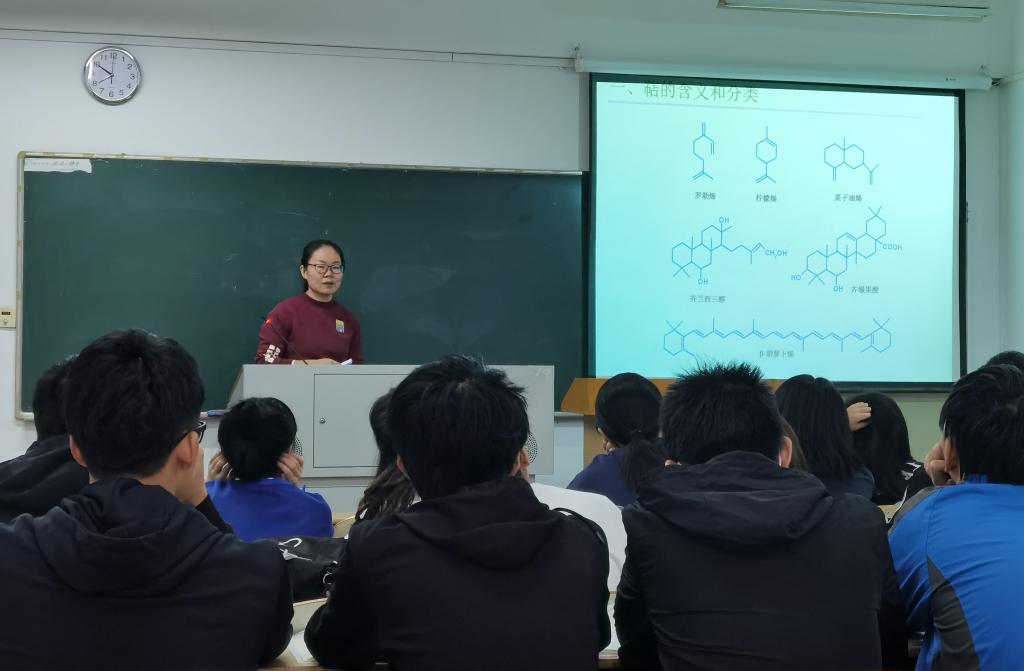 赖晓晶老师带来了《天然药学化学》中“萜类和挥发油”章节,从黄花蒿中所含的倍半萜类化合物、银杏中所含的二萜类化合物等大家耳熟能详的实例引入,主要讲授天然产物萜类及挥发油类化合物的含义、分类、生理活性等内容。赖老师通过互动教学、案例教学等方法打造活跃的课堂气氛,融入了课程思政的元素,最后采用分类浓缩的形式归纳本章节的重点内容,授课全程吸引住了每一位听课者的注意力。