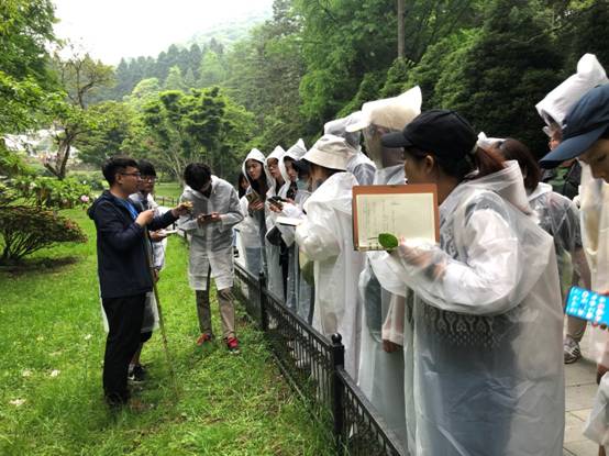 10日一早实习队伍来到中国科学院庐山植物园。“人间四月芳菲尽,山寺桃花始盛开”,时任江州司马白居易在庐山大林寺写下这千古名句,充分表明了高海拔地区物候因温度差异较平原地区的滞后性。本次实习从以往的6月调整到5月,刚好赶上庐山的花期,强化了本次植物学实习的效果。