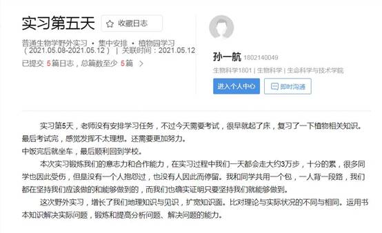 本次实习,不仅是对植物学、动物学、生态学等课程课堂知识和室内实验内容的必要补充,更增强了学生对自然界生物的认识、培养了学生理论联系实际和独立分析问题、解决问题等综合能力,在学生专业意识的提升上发挥了粘合力。学生在实习日志中留下了丰富的笔记,野外实习给他们带来的专业学习、人生态度上的收获将在日后的成长缓慢散发余热。