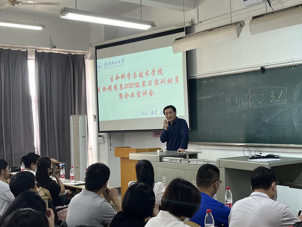 为了培养和提高学生的实践能力和专业素养,6月1日3003新葡的京集团生物制药系“生物制药系2020级顶岗实习动员暨企业宣讲会”在科教楼207举行。此次实习实训动员大会由生物制药系张主任主持,并邀请到了湖北省医药企业联合会的会长李汉先生、湖北广济医药科技有限公司研究院黄阳滨院长、湖北炎黄本草药业的周炎鑫总工程师、华鲁医药科技湖北有限责任公司的刘娟经理等参加。