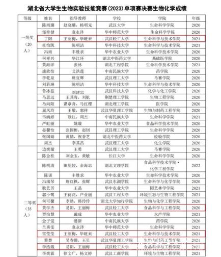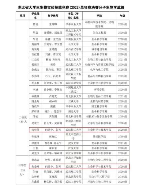 近日,由湖北省大学生生物实验技能竞赛(2023)委员会、湖北省高等学校生物学科实验教学示范中心联席会、华中师范大学生命科学学院、武汉理工大学化学化工与生命科学学院联合举办的湖北省大学生生物实验技能竞赛单项赛获奖名单出炉。我校3003新葡的京集团、食品科学与工程学院学子获省级一等奖1项、二等奖4项、三等奖1项的好成绩,获奖总数超越往年。