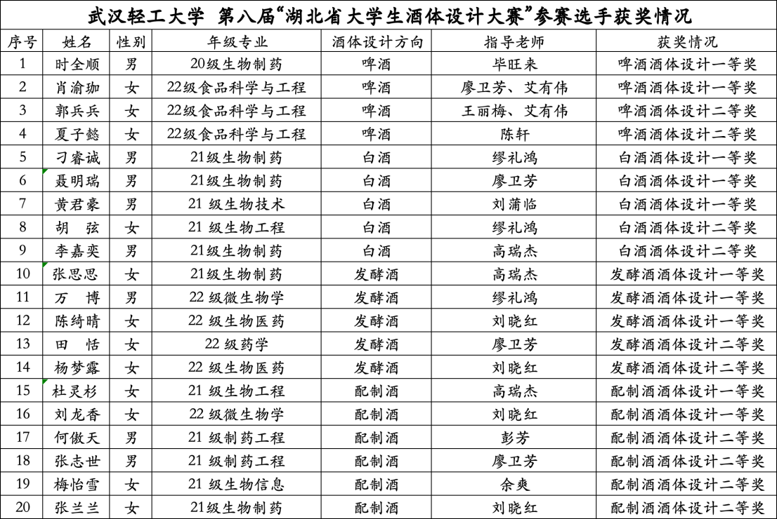 本次大赛由湖北省酒业协会、华中农业大学和武汉轻工大学联合举办,决赛汇聚了来自华中农业大学、湖北工业大学、湖北大学、武汉工程大学、江汉大学等全省20余所院校的170名选手同场竞技,并将所培训理论的知识运用到真枪实战的设计酒体及品酒考试之中。大赛裁判组由16所高校的18名教师和12家知名企业的16名国家级白酒、果露酒、啤酒品酒大师组成,大赛考核贴近生产一线。经过一天的激烈角逐,我校学子取得十项一等奖、十项二等奖的好成绩,廖卫芳老师荣获优秀指导老师称号,武汉轻工大学获评优秀组织单位。