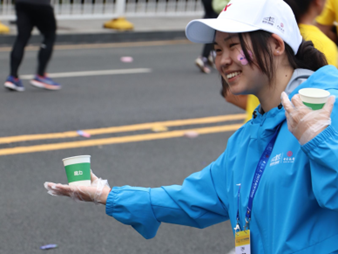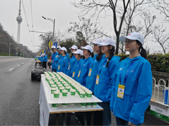 天色渐亮,武汉马拉松鸣枪开跑。三十多分钟后,第一批选手来到7.5公里服务站点,志愿者们及时为参赛选手提供饮水服务。用水站志愿者将海绵浸泡在饮用水中,并将浸水海绵摆放在托盘中,让全力奔跑的选手能最快速简洁地拿取。饮水站志愿者提前倒水,按选手前进方向前疏后密摆放纸杯。手掌平伸,手臂随前进方向小幅摆动递水,志愿者伸出手的角度、脸上的微笑,都只为一次完美的服务。每一名志愿者都在践行自己岗位的职责,发光发热。