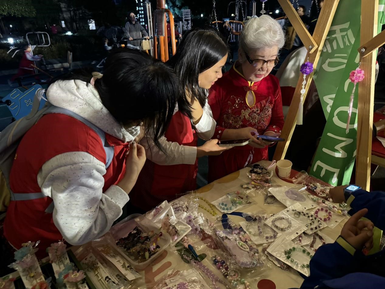 志愿者们到达社区之后,与社区工作人员进行了沟通交流,了解了各自所需负责的工作。在活动期间,志愿者们各司其职,一部分志愿者帮助“常青花园第五社区爱心帮帮团”进行手工艺品的义卖;一部分志愿者负责售卖珠串,项链等精美饰品;剩下的志愿者则维持现场的秩序,以确保义卖活动的正常进行。在社区工作人员和志愿者默契的配合下,义卖活动有条不紊地进行着。